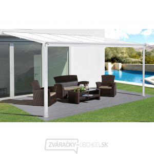 Hliníková pergola k stene, dĺžka 3,12 x 3 m, biela konštrukcia, strecha - bronz komôrkový polykarbonát 6 mm.