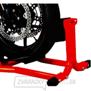 Stojan na parkovanie alebo transport motorky. Pevná, robustná oceľová konštrukcia poskytuje stabilnú podporu. Akonáhle motocykel nabehne na preklápací nájazd stojančeka, okamžite je jeho predné koleso zovretím stabilizované a usadené v stojane. V tejto zaistenej polohe môže potom byť motocykel prepravovaný alebo je bezpečne zaparkovaný.