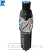 Konštrukcia: manometer 0-10 bar, otočná hlavica (-> aretácia pracovného tlaku), filtračná vložka, nádobka na zachytávanie kondenzátu, výpustný ventil (-> manuálne odpúšťanie kondenzátu).