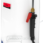 Konštrukcia: ergonomicky tvarovaná rukoväť (vr. uzamykateľné spúšte rozprašovača), automatické čerpadlo, krytom chránený port akumulátora, 15 l nádoba s filtrom nečistôt.