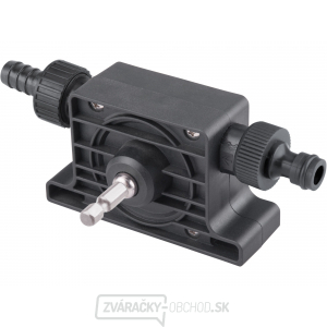 Ďalšie parametre : závit oboch hrdiel G3/4", hriadeľ 1/4" šesťhran, na čerpanie vody s teplotou 5-40 °C, max.nasávacia hĺbka 1 m a výtlačná výška 3 m; dodávané s 2 ks dýz/adaptérov závit G3/4"- spojka 1/2", 1 ks dýzy/adaptéra závit G3/4"- objímka priem. 8 mm a hadicová svorka.