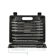 Súprava 13 vrtákov: 5,5 x 110, 6 x 110, 5 x 160, 5,5 x 160, 6 x 160, 6,5 x 160, 7 x 160, 8 x 160, 10 x 160, 14 x 210, 10 x 160, priebojníky 2 x 2 mm, 2 x 160 mm, razníky 2 mm ploché dláta: 250x20, 250x40 mm fréza: 250 plastové puzdro mm