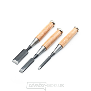 Japonské stolárske dláta od značky YOITARIKI typu Tataki Nomi 叩き鑿- základné rovné dláta vhodné pre základné opracovanie dreva. Sú osadené kovovým prstencom na konci rukoväte na ochranu rukoväte pri pritĺkaní stolárskou paličkou či kladivkom. Sada obsahuje 3 kusy so šírkou čepelí 9 mm, 15 mm, 24 mm. Vyrobené v Japonsku.
