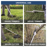 Aku multifunkčný stroj 4v1 Scheppach BC-MFH400-X zastane prácu ako 4 najobľúbenejšie záhradné stroje - krovinorez, strunová kosačka, plotostrih a prerezávacia píla. Je ideálnou voľbou pre každého, kto hľadá spoľahlivý nástroj na komplexné záhradné práce. Vyžínač disponuje strunovou hlavou pre strunu 1,6 mm s funkciou odvíjania a veľkým pracovným záberom 380 mm. Trojubý oceľový kotúč s priemerom 255 mm sa hodí na kosenie prerastenej trávy alebo náletov. Plotostrih má veľký dosah , dĺžku lišty 390 mm a nastaviteľný uhol hlavy v 11 polohách. Kvalitné nože vyrezávané laserom a brúsené diamantom si poradia s vetvami s priemerom až 24 mm. Praktická prerezávacia píla má dĺžku lišty 254 mm, maximálnu rýchlosť reťaze 18 m/s, tri nastaviteľné rýchlosti (12, 15 a 18 m/s) a automatické mazanie reťaze. Vďaka dlhému dosahu nemusíte pri bežných stromčekoch používať rebrík. Zariadenie umožňuje jednoduchú výmenu nástavcov bez použitia náradia a nastavenia rýchlosti nástrojov prostredníctvom ovládacieho panelu blízko rukoväte. Pohodlie pri práci zaisťuje ergonomický popruh cez rameno s rýchloupínacím mechanizmom, ktorý znižuje únavu aj pri dlhšom použití. Stroj sa dodáva bez batérie a nabíjačky. Moderný bezuhlíkový motor (Brushless motor ) ponúka vysokú účinnosť, dlhšiu výdrž batérie, dlhú životnosť a minimálne opotrebenie. Stroj je plne kompatibilný so všetkými akumulátormi a nabíjačkami radu Scheppach IXES 20V, ktoré ponúkajú maximálnu flexibilitu a pohodlie bez káblov. V tomto prípade sú na prevádzku potrebné 2 batérie.
