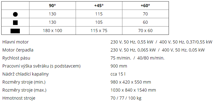 - Stroj môže byť vybavený dvoma druhmi motorov. Jednofázový motor (230 V) s univerzálnou rýchlosťou pásu 75 m/min. umožňuje jednoduché pripojenie k sieti. Trojfázový dvojrýchlostný motor (400 V) s rýchlosťou pásu 40 a 80 m/min. je vhodný pri častejšom delený plných materiálov a hrubostenných profilov.