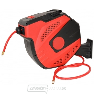 Držiak navijaka umožňuje natáčanie telesa navijaku o 180 °. Jednoduchá montáž navijaku na stenu, strop alebo inú konštrukciu, inštalačný materiál je súčasťou dodávky. Vysokotlaková PVC hadica (prevádzkový tlak 18 bar) má dĺžku 30 m a vnútorný priemer 3/8 "(9,5 mm), je ukončená koncovkou s vonkajším závitom 1/4" opatreným teflónovým tesnením. Hadica je v navinutom stave chránená skríň pred poškodením, čo významne predlžuje jej životnosť. Navijak sa pripája na zdroj stlačeného vzduchu vysokotlakovou PVC hadicou dl. 2 m ukončenú koncovkou s vonkajším závitom 1/4 "opatreným teflónovým tesnením. Na hornej časti telesa navijaka je integrovaný držiak pre jednoduché prenášanie