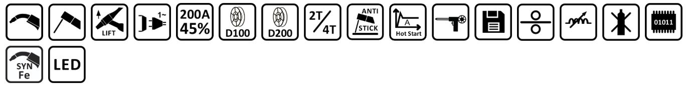 Vlastnosti: Digitálne ovládanie, Hot Start, TIG Lift, nastavenie indukčnosti, zváranie bez plynu, dvojvalcový podávač, možnosť Spool Gun, nastavenie pamäte, Anti-Stick, TIG Lift, zváranie bez plynu.