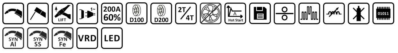 Vlastnosti: 2T/4T, Zastavenie ventilátora, Zásuvka 36V AC, Horúci štart, Mikrokontrolér (MCU), Pamäť nastavenia, 2 kladkový podávač, Duálny pulz, Dofuk plynu MIG, Predfuk plynu, Pulz MIG, Pulz TIG, Nastavenie indukčnosti, Zváranie bez plynu, MIG Voľba elektródy, Voľba jazyka, LED displej.
