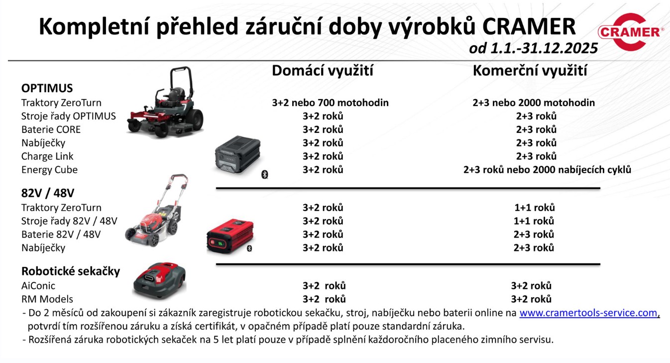 *Do 2 mesiacov od zakúpenia si zákazník zaregistruje stroj, nabíjačku alebo batériu online na www.cramertools-service.com a potvrdí tým rozšírenú záruku a získa certifikát, v opačnom prípade platí iba štandardná záruka.